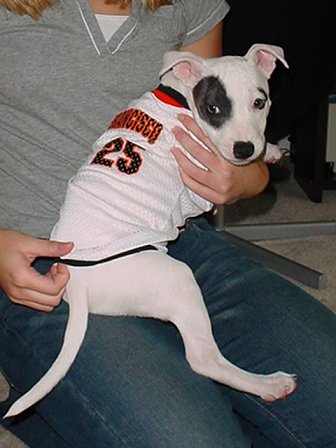 BLUE DOGS Below are some of the beautiful Yankeestaff blues, whites and white and blues. Because we do not believe that Staffordshire Bull Terriers should be bred for a certain color, we likewise are not afraid to breed ANY color recognized in the breed-standard! Our breeding program is all about excellence of temperament, athletic soundness and classic type. If a dog possesses those traits, it is worthy of inclusion in the gene pool, to the benefit of the future of the breed. Yankeestaff was one of the first to embrace the challenge of perfecting Staffordshire Bull Terriers of any and all sanctioned colors. If our decision results in people having more color choices, that's an added bonus! |